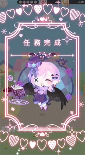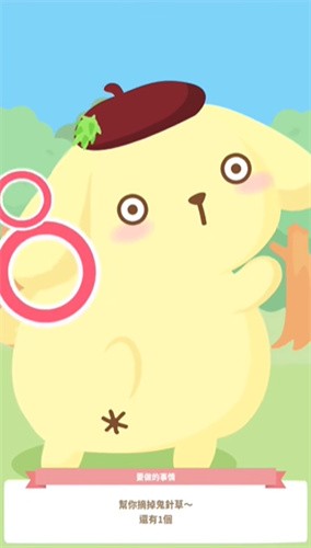 有点麻烦同时也是后期最常出现的互动形式。任务形式是三丽鸥小伙伴需要别的伙伴的某样素材,拜托你去取得交给她/他。举例玉桂狗需要音符草,接受任务后,需要去美乐蒂的花店帮忙,获取音符草(帮助美乐蒂获得的素材是随机的)。当获取到音符草后,此时玉桂狗的房子上会出现绿色勾勾,再次点击进入,进行对话框互动即完成任务。