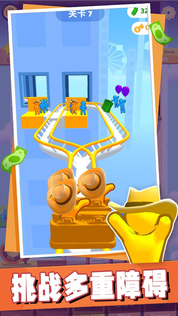 火柴人无敌战舰的设定十分趣味,游戏专门为玩家们设定了一辆过山车,体验感非常丰富刺激,玩家的任务就是在其他的火柴人进行过山车玩耍的时候来收集资源去进行升级,在玩耍的时候过山车轨道上会随机出现各种障碍,要想安全通关也就需需要解锁更多的座椅,让你的过山车不断进行升级,可以容纳更多的游客前来玩耍。