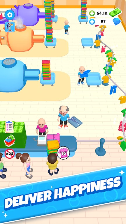 1、随意滑动屏幕,控制角色,移动把脏衣服放到生产线上;