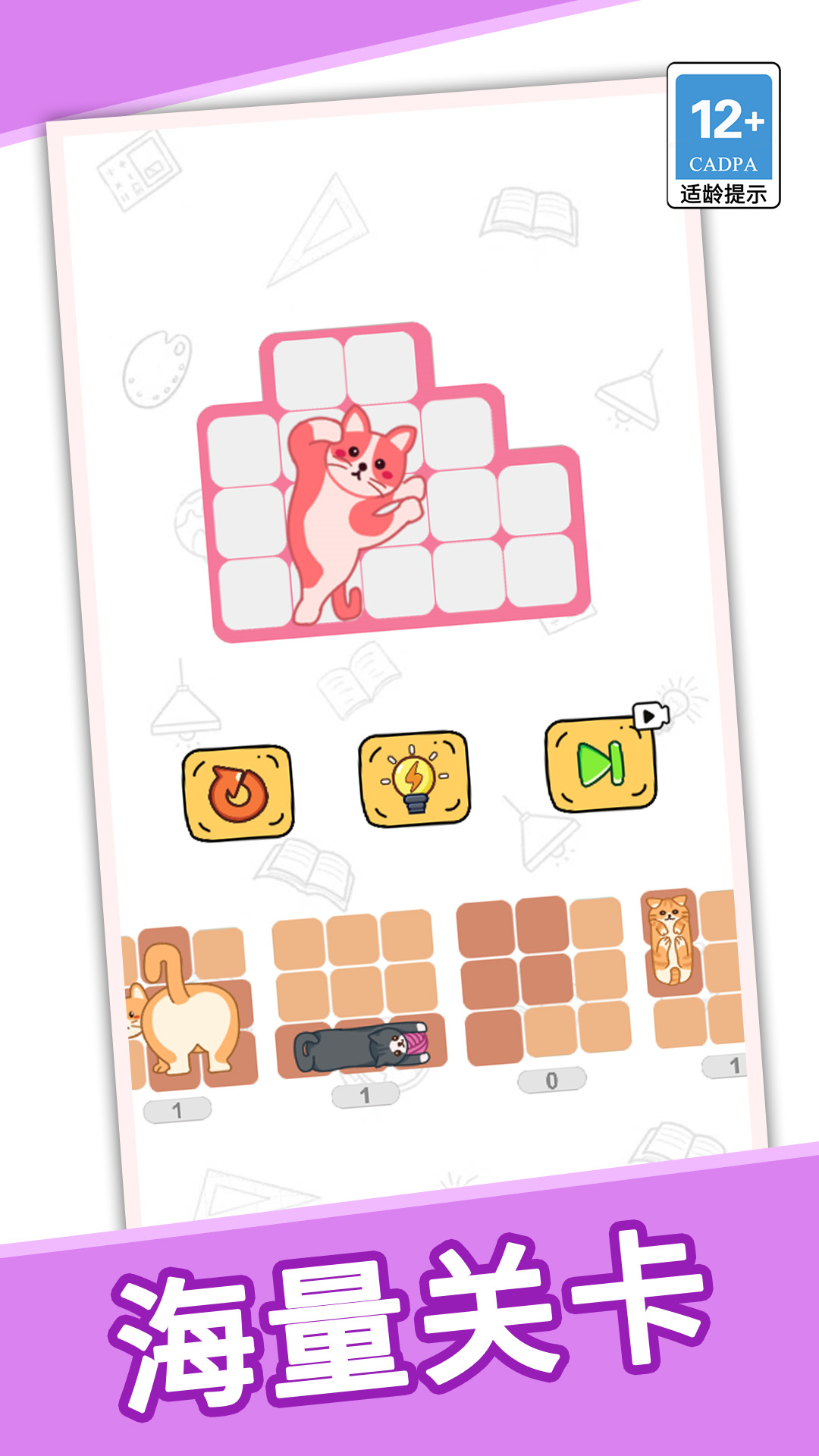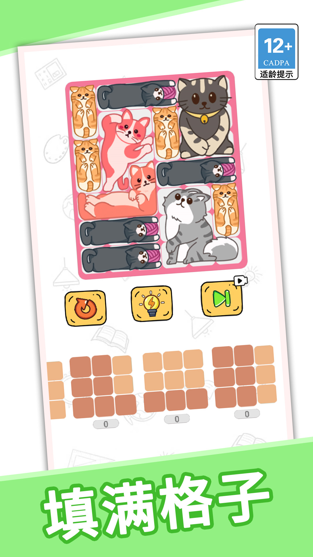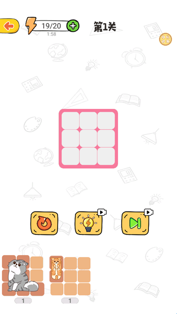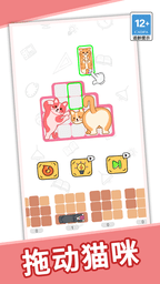 3.玩法从简单到困难,将所有的猫猫拼图给严丝合缝的塞到方格中吧;