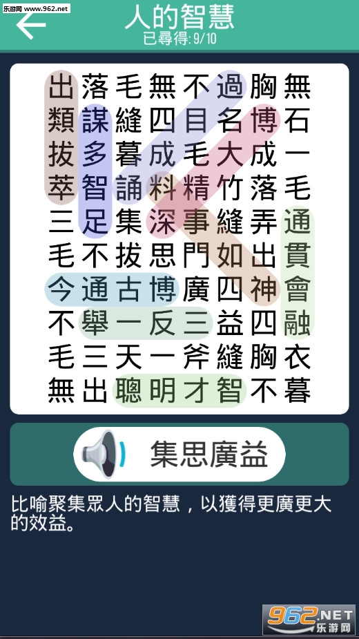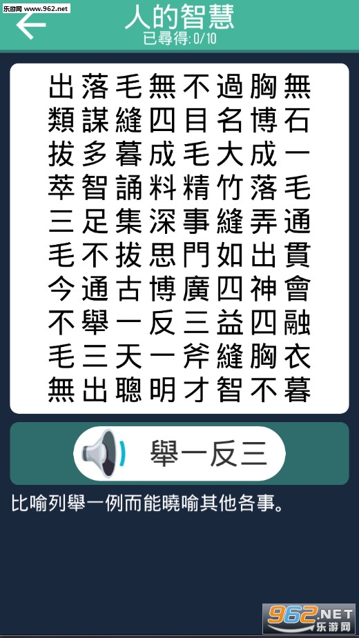 非常不错的成语学习类游戏,寓教于乐,在玩游戏的过程中学习到众多的成语,游戏很简单,因为成语是直接给出来的,朋友们去给出的汉字中找出来即可,成语有着解释,这点非常不错,喜欢的朋友可以下载试试。