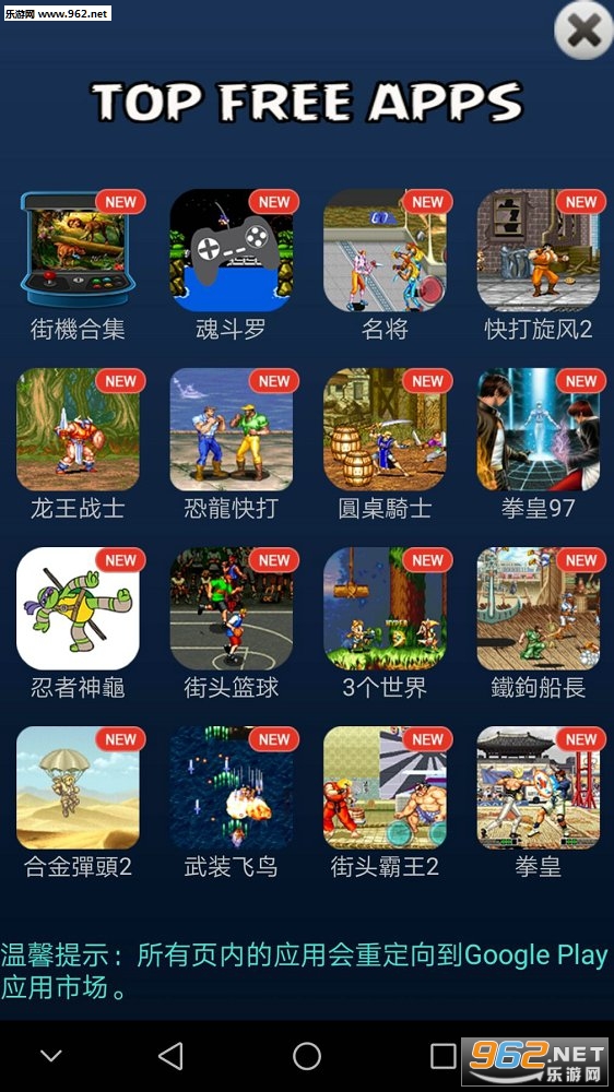 这是一款模拟器,其中有着我们当初在街机游戏厅中才能玩到的一些游戏,这些经典游戏相信去过游戏厅的乐友们绝对不会陌生。比如图标上的三国志就是其中之一。在这个模拟器中有着十六种游戏给你选择体验,而且这些游戏都是可以玩的,。其中恐龙快打、三国志、拳皇97、圆桌骑士等都能在这里玩到。更有经典的魂斗罗和雷霆战机。是不是很有体验的冲动,当然,这些游戏可是在电脑时代来临后就很少有玩家们能去体验了,这些经典也就只剩下怀念。如今在手上这个模拟器中就可以体验那个小学到中学时代的情怀,真实心情澎湃不已。