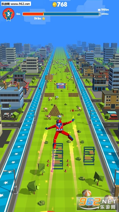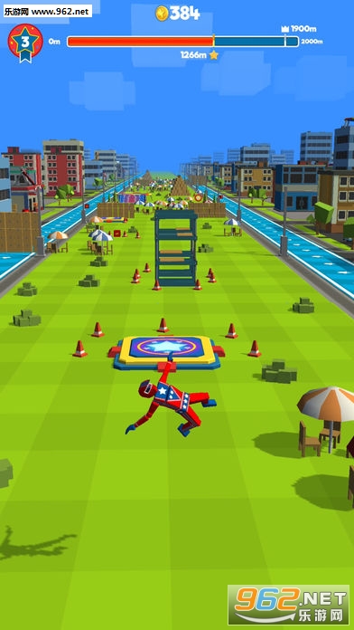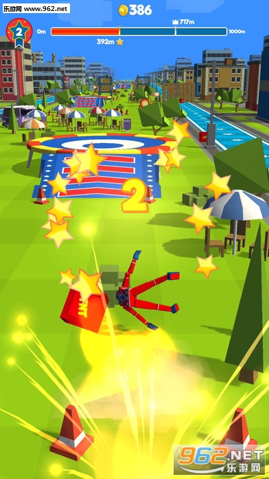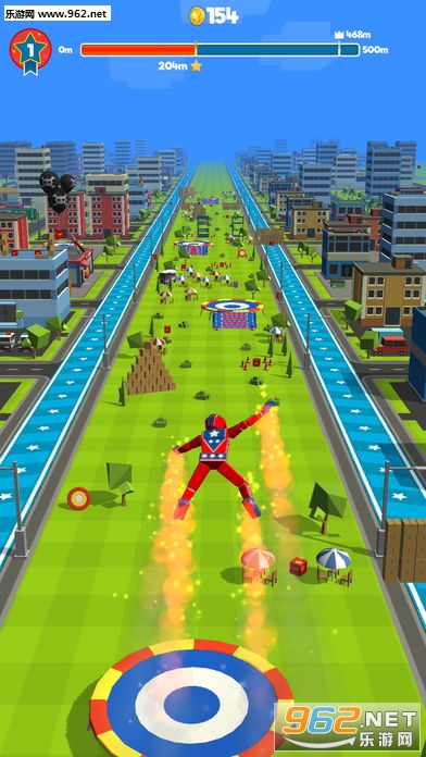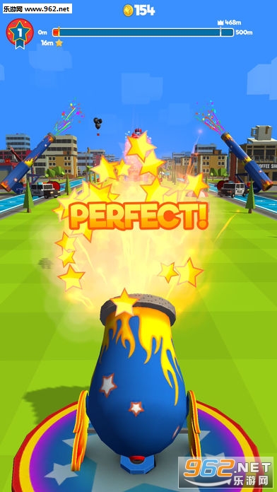 尽可能用力地发射大炮,当你降落时,碰到TNT或蹦床还可以获得加速的动力。