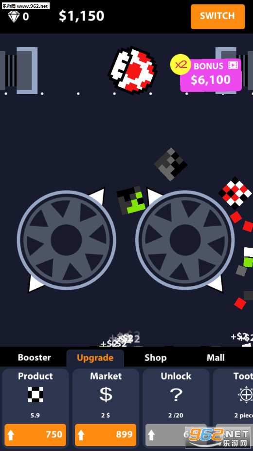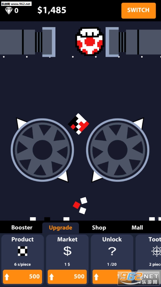 《超级破碎机安卓版》(Super Crush Machine)是一款像素风格的放置类休闲手游,游戏中会有着两个旋转的滚轮,有着两个柱体一直开合,上面会一直掉落下各种物品,首先柱体会将物体压碎,然后两个滚轮进一步的碾压,最后碎片掉落在地上会获得一定的金钱。