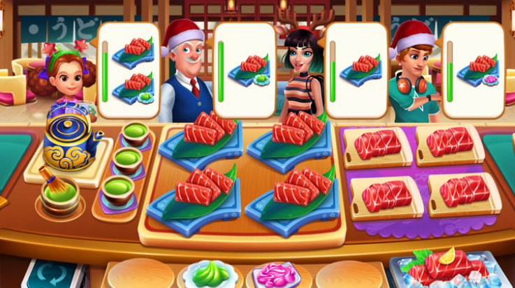 2、完成不同的任务,提高您的店铺水平,用不同的装修来匹配您的店铺,吸引更多的顾客,解锁不同的食物,了解更多的食物制作。