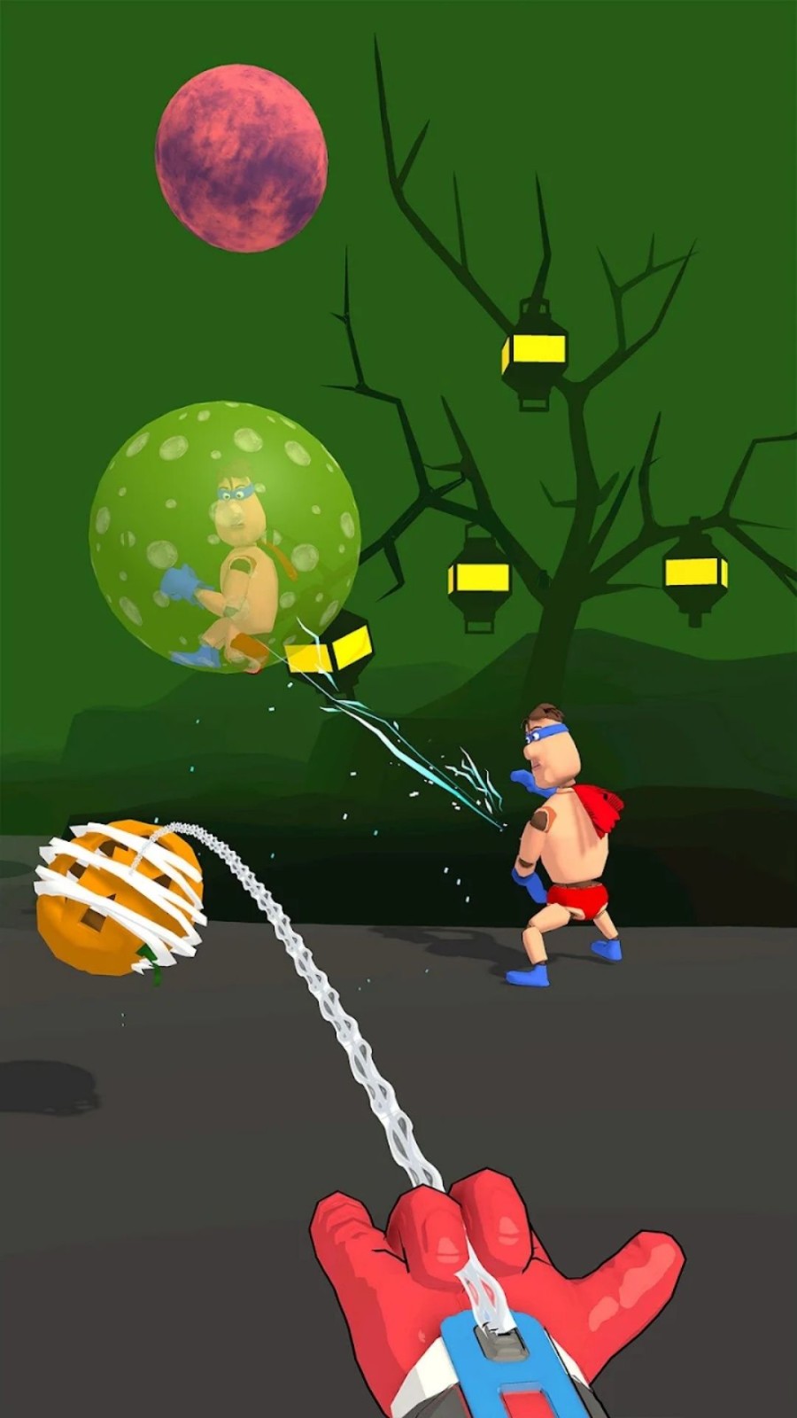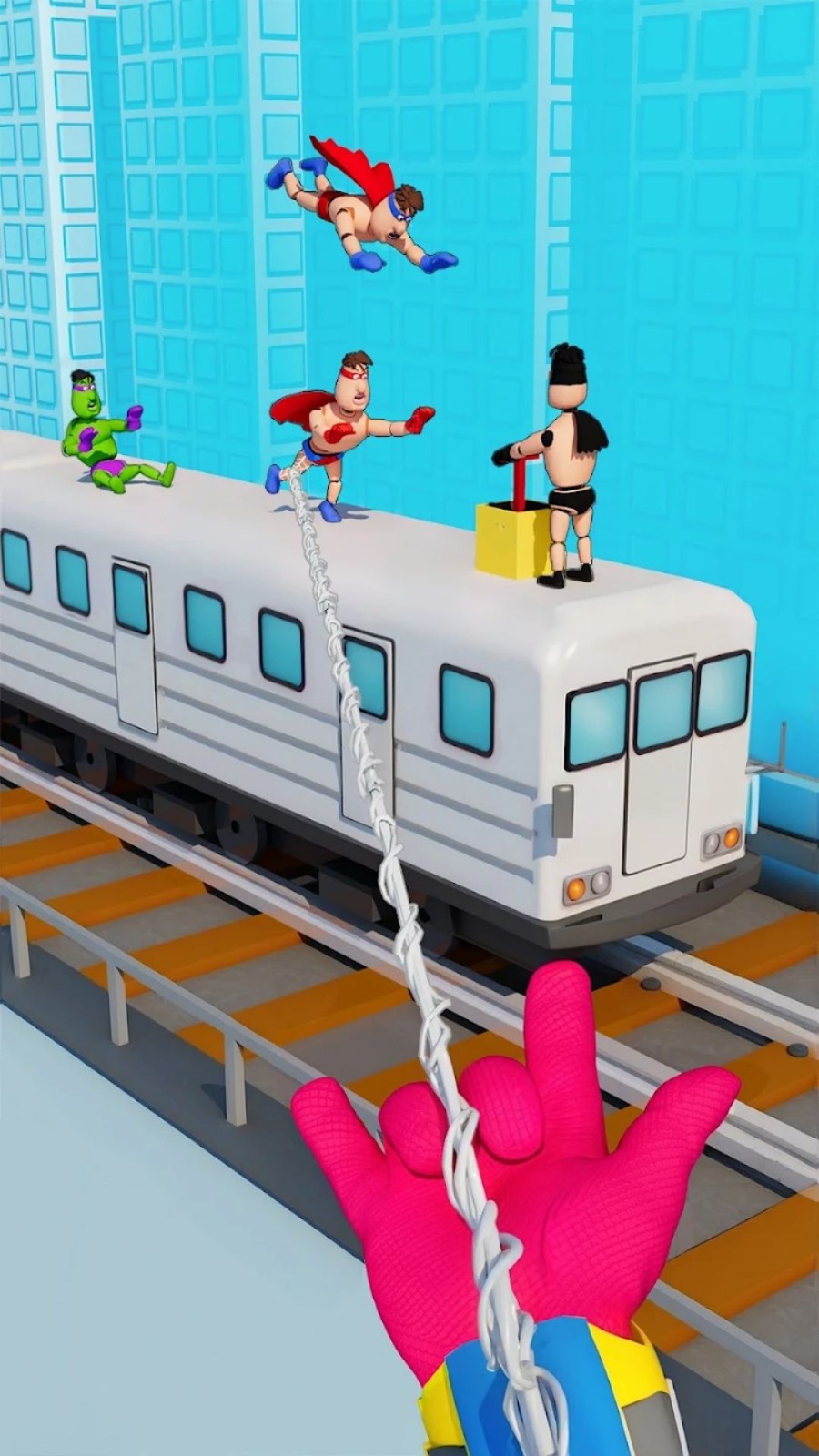 1、在关卡中滑动屏幕瞄准英雄,投掷蛛丝黏住目标后拖动拉扯,直至其撞击场景物件粉碎。