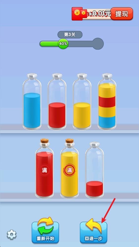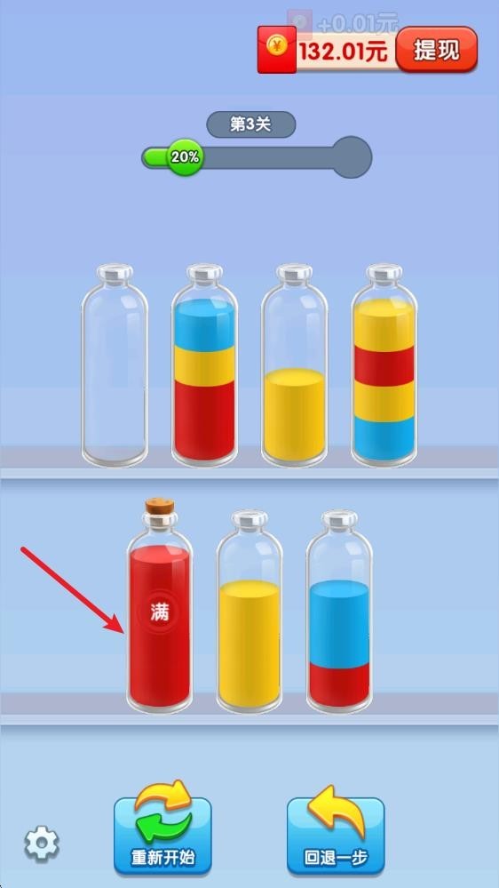 4、成功将所有颜色的液体都灌满瓶子即可顺利过关,获得对应的奖励。