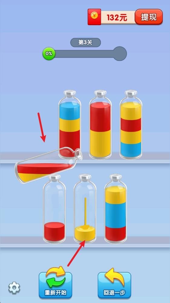 3、游戏中的瓶子里装有不同颜色的液体,玩家可以点击瓶子将同一颜色的液体放到一个瓶子里,等待同一颜色液体倒满瓶子后即可通关,通关可获得金币奖励,收获不同的挑战趣味。