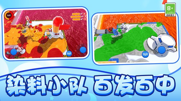 3、操纵人物喷出五颜六色的油漆,铺满整个场地来持续占领对方的领地。