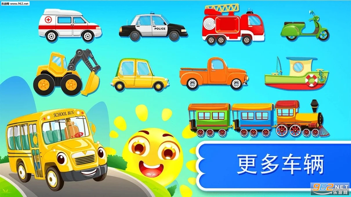 完成11个不同的交通工具拼图,包括飞机,火车,校车,卡车,轮船,航天火箭等,当完成拼图后,会播放车辆的声音以及单词语音。