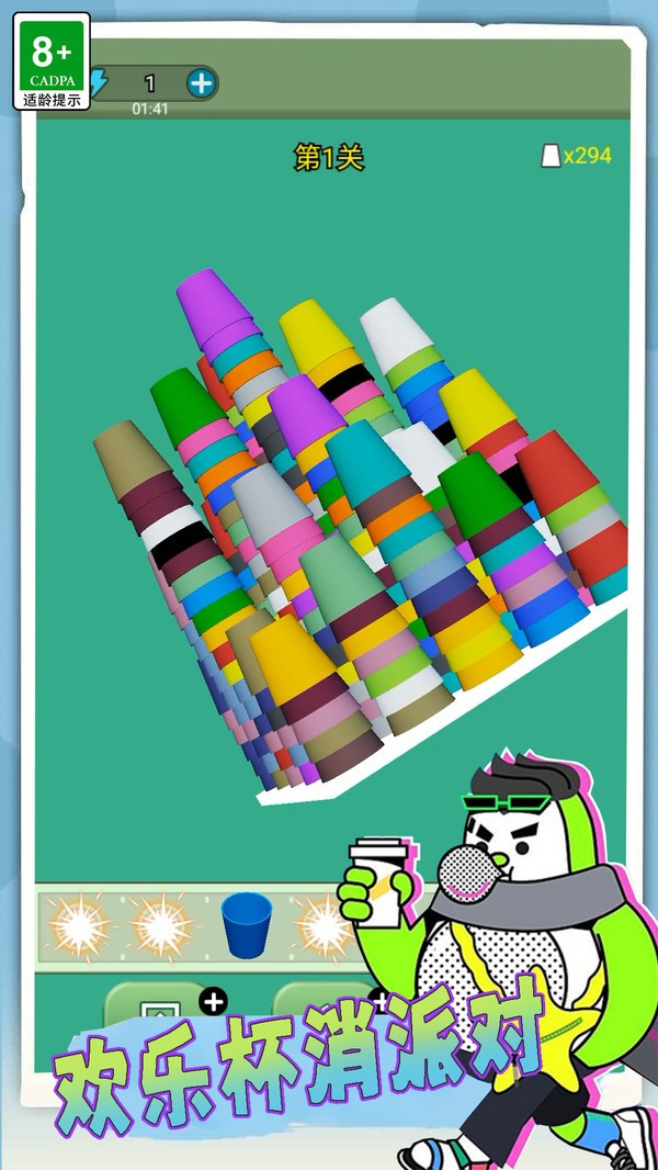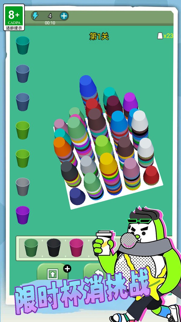 1、在游戏中,玩家需要消除相同颜色的杯子来完成关卡目标。