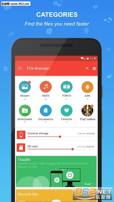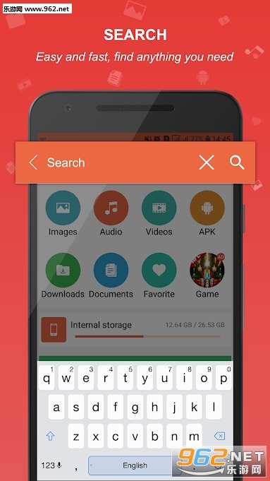 优化的搜索引擎将在1秒内找到内部存储和SD卡中的文件。用户可以按流派浏览文件,例如照片,音乐,视频,应用。