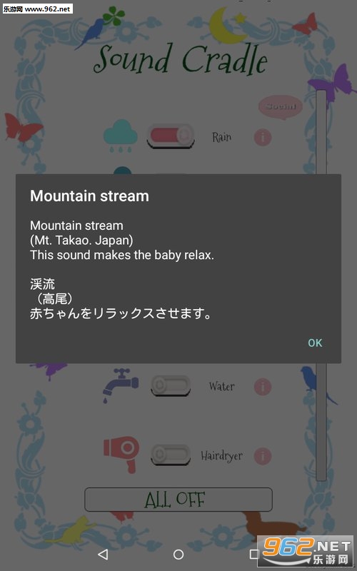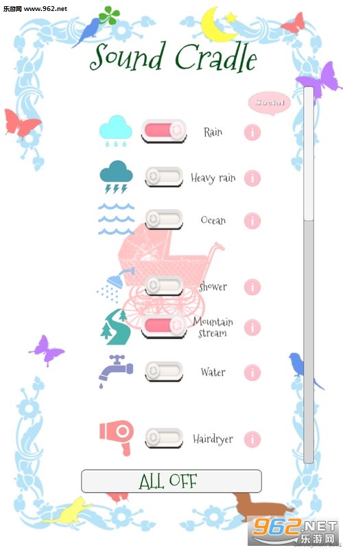 音摇篮为您带来最广泛,最多样化的白噪声和婴儿睡眠声音选择。从海洋和雨声,到吹风机和水,您将拥有所需的所有声音,让您一目了然地放松和放松您的小家伙。点击打开/关闭并享受!