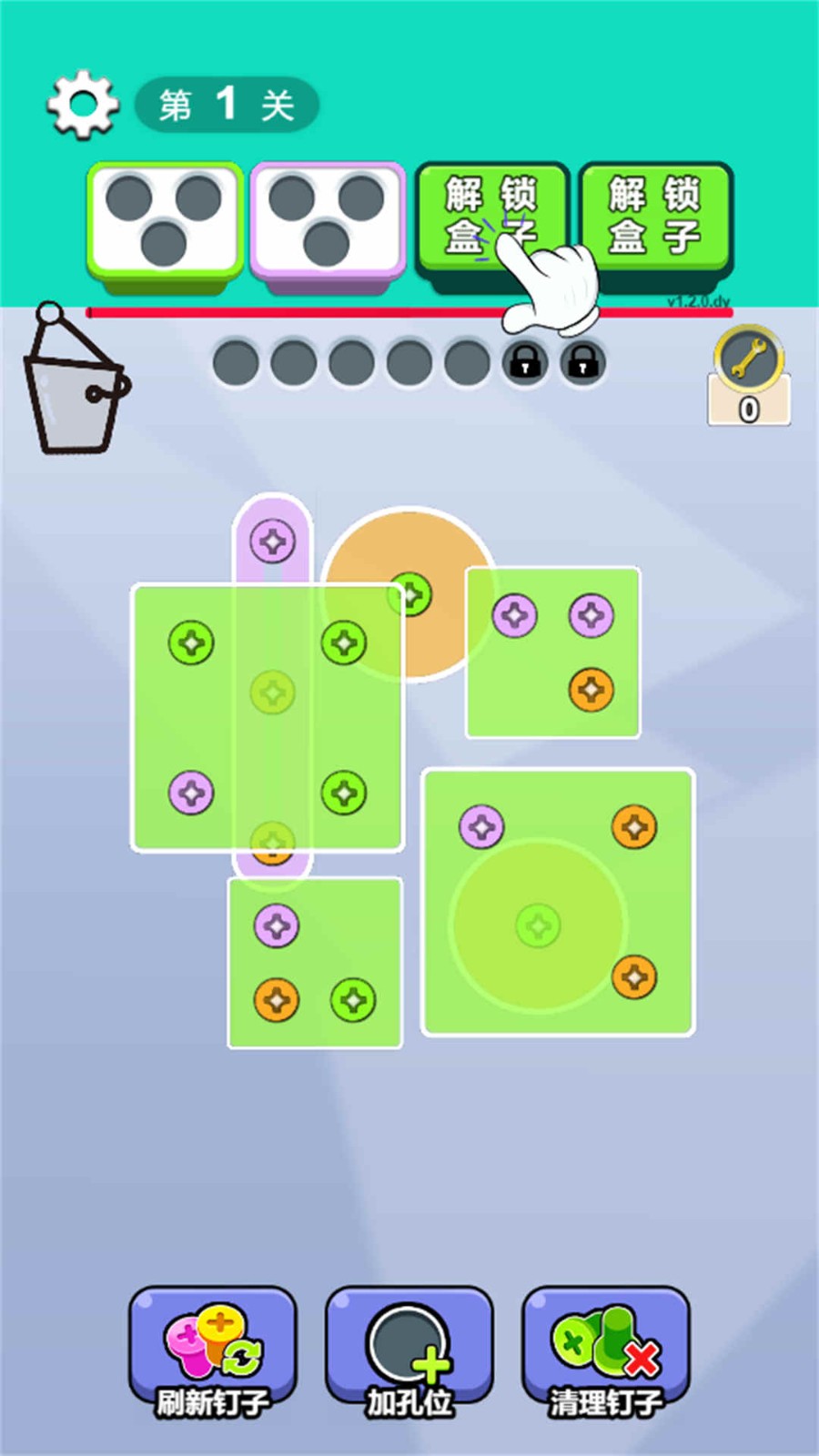 2.点击相同的螺丝会被放置到同色的盒子中,需要凑齐三颗螺丝才能够被消除掉。