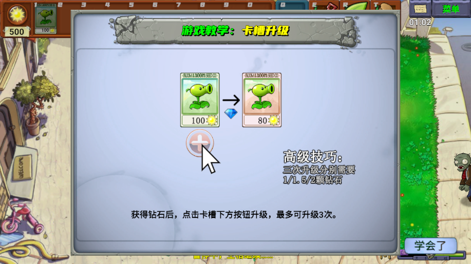 6、击败僵尸可以获得钻石,使用钻石可以升级你的植物,从不同的选项卡选择。