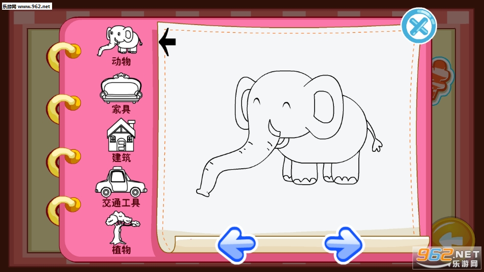 2.图形填色,有5大类图形,动物、家具、建筑、交通工具和植物,可自由在图形上填色上色,并且可以播放动画。