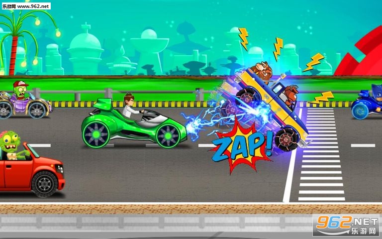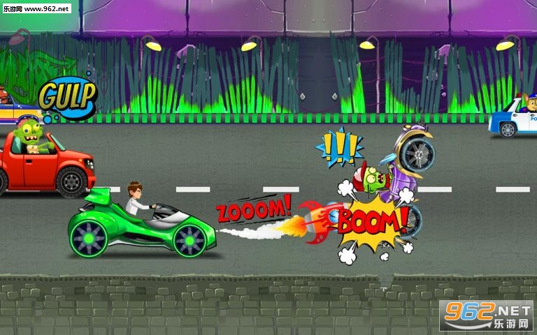 游戏中你需要帮助Ben尽可能快地比赛并通过收集能量提升并向敌人车辆射击来摧毁外星人汽车。逼真的赛车驾驶体验和爆炸,如果敌人破坏了你的车则游戏结束,所以尽量避免对手车,不要忘记收集像火箭和计时器的加电时间延长。