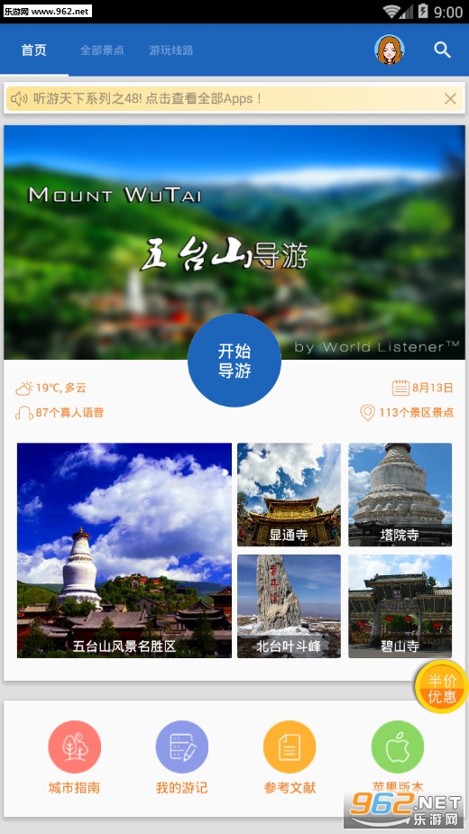 五台山导游:专业的智能语音导游系统,专门为喜欢自由行的旅行爱好者而设计。五台山导游是将语音导游、门票信息、旅游攻略、景点美图、旅游足迹等全面集中展现。