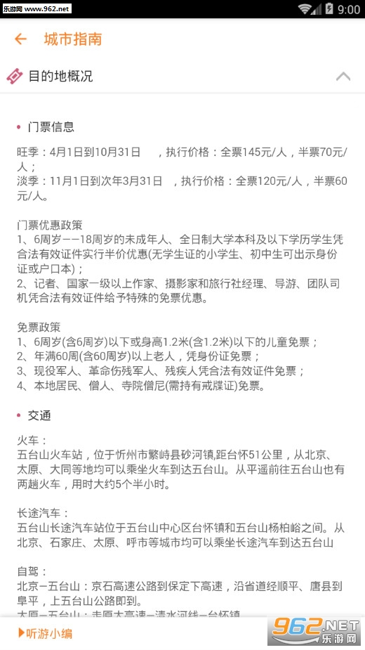 非常不错的旅游工具,朋友们可以在软件了解一些五台山的游玩攻略,可以查看开放时间和门票价格,了解五台山的文化历史等,喜欢的朋友可以下载试试。