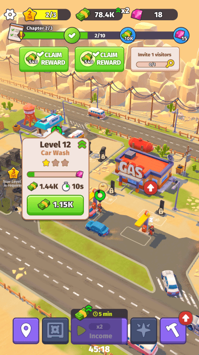 在沙漠中创建您的业务。帮助汽车和客户。您的加油站是严酷世界中的绿洲。将它从一个枯燥、破败的地方改造成一个成功的企业!