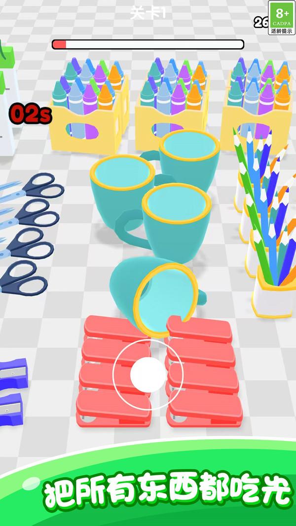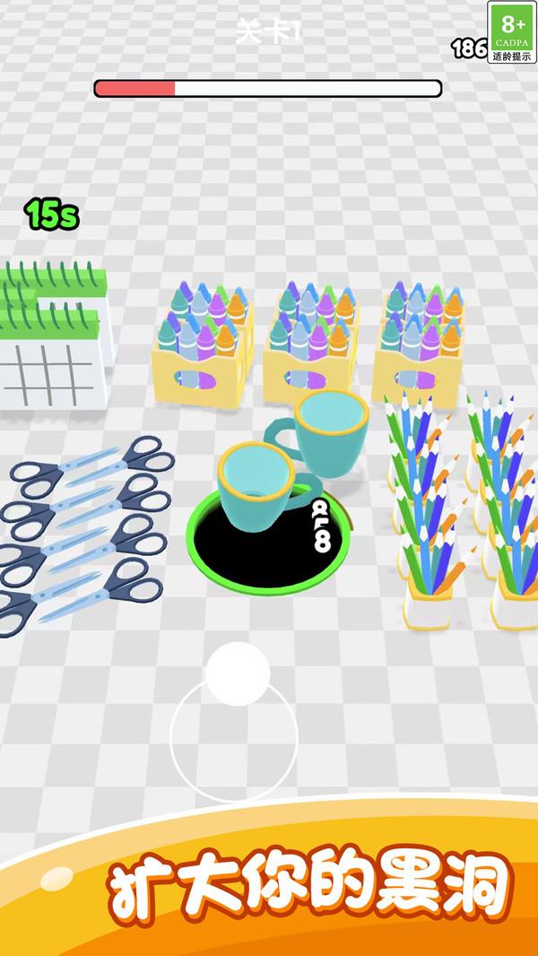 2、随着黑洞体积增大,可吞噬的物品从文具,星球层层升级,成就感同步攀升;