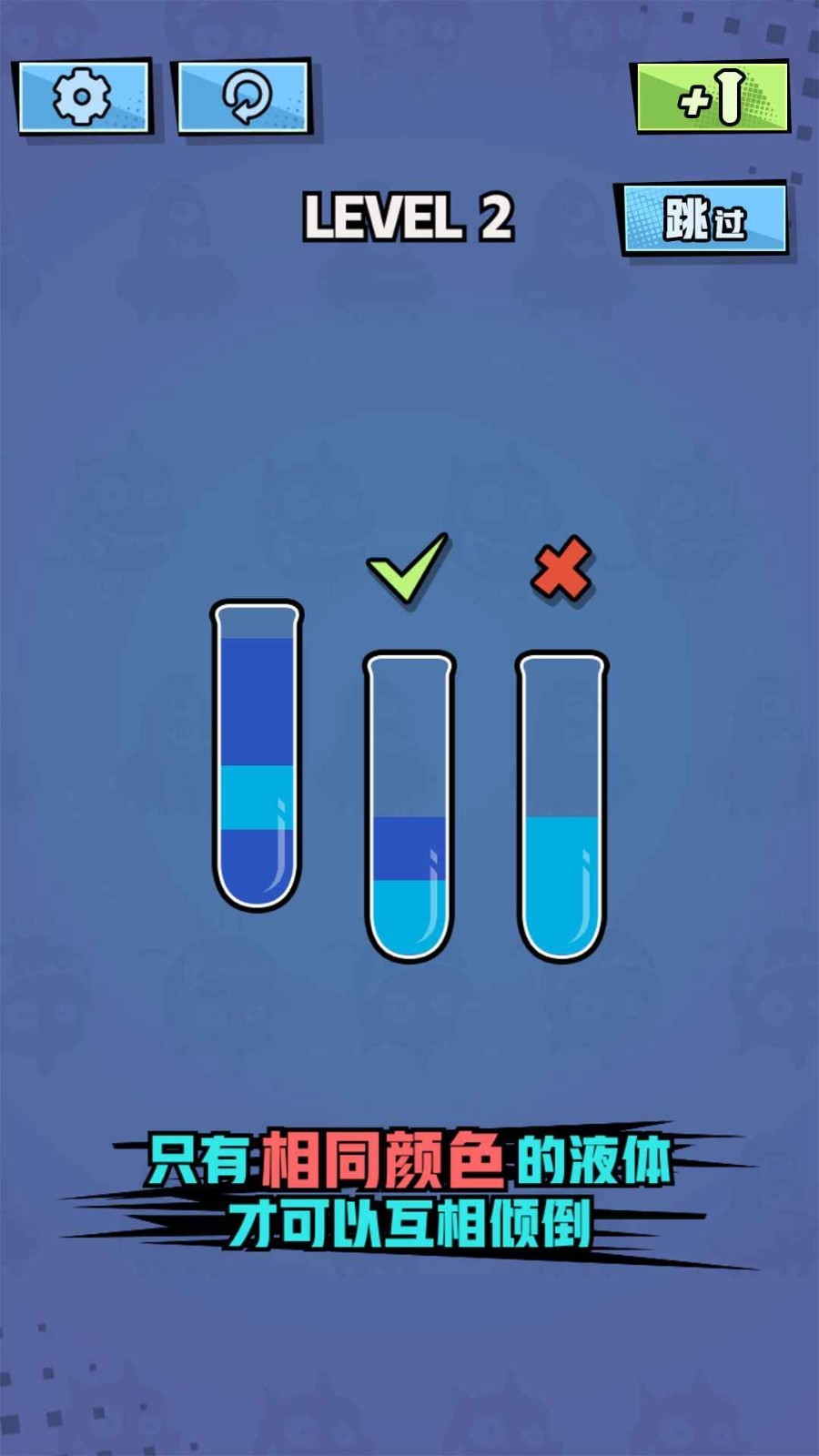 3、注意,只有颜色相同的液体才可以互相倾倒,