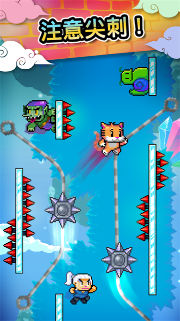wall kickers的关卡挑战内容非常具有挑战性,玩家需要按照游戏给予的相关规则来进行挑战,不然就会面临失败,游戏的场景设计采取经典的像素卡通风格,操作简单轻松,你可以按照点击屏幕的方式来控制其中的角色动作,并进行不断的跳跃来跨过其中的关卡障碍,当你通关之后就可以解锁更多的角色装扮和挑战玩法,记住闯关过程中一定要集中注意力哟。