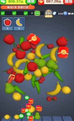 这是一款类似开心抓大鹅玩法的三消游戏,闯关时只要按要求消除相应的物品就行了,不用全部都消除完。