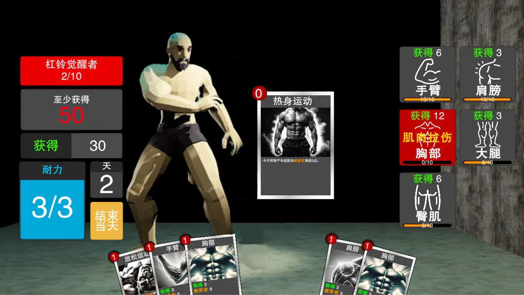 玩家将扮演一位健身爱好者,利用卡牌构建系统来规划日常训练、饮食和休息,逐步增强角色的体能和肌肉体积,最终在健美比赛中取得胜利。在游戏过程中,玩家需合理组合锻炼、休息和营养卡牌,以塑造理想的体型。每张卡牌都具有独特的效果,同时游戏引入了肌肉疲劳系统,过度训练可能会导致受伤,因此玩家需要在锻炼和休息之间找到平衡。
