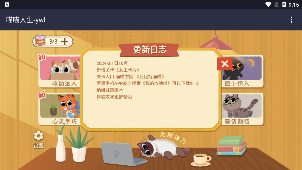 喵喵人生拥有丰富的关卡设计,每个关卡都有不同的收纳任务和难度。随着游戏的推进,玩家将逐渐解锁更多具有挑战性的关卡,如多层收纳、限时收纳等。这些关卡不仅考验玩家的收纳技巧,更考验玩家的耐心和创造力。只有真正掌握了游戏的精髓,才能在收纳物语的旅程中不断进步。