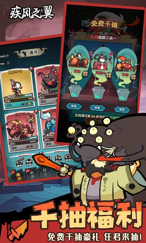 1、疾风之翼(0.1折天天送648)是一款休闲点击类卡牌手游,玩家将作为猎妖师,召集魂将一起斩妖除魔。游戏将历史上有名的经典人物设计为卡通魂将,玩家可通过打怪获得的符咒进行魂将召唤,与廉颇、曹操、程咬金等魂将一起打怪升级!当然,除了经典魂将外,还有黑白无常、鬼面等强大BOSS等待挑战!