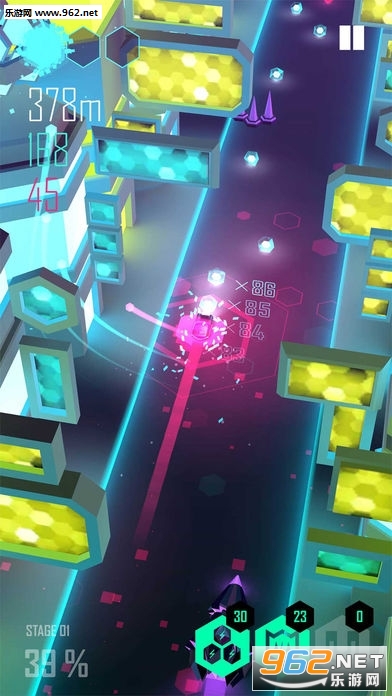 往上滑跳跃往下滑发射攻击击退追逐你的飞船,剩下的就是在三条道上左右滑吃豆豆躲避尖刺,这倒是和地铁跑酷如出一辙,但这玩意儿可以一款纯正的音游,路上捡的豆豆在游戏里就叫“节奏”。