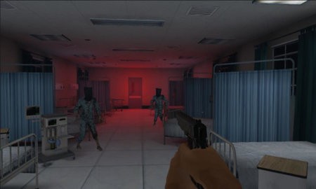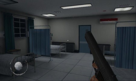 1、在一开始我们来到无尽噩梦诡医院医院当中,首先左右查看四周,之后走向大门。接着进行瞄准,干掉两个小怪物