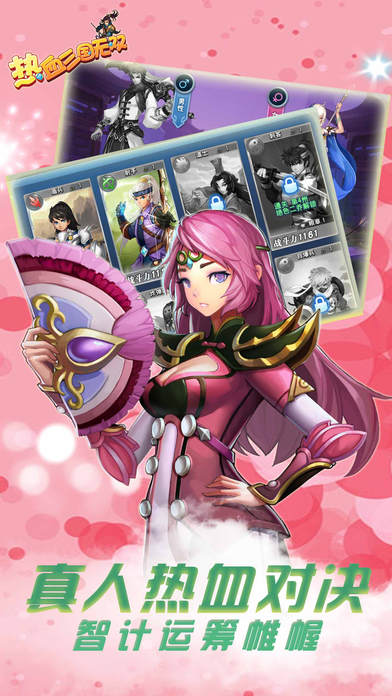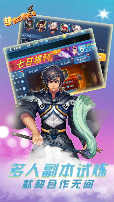 最受期待的三国题材军团争霸策略手游《热血三国无双》现重磅来袭!小说改编而来的游戏故事等你尝试,没有遵循着小说剧情发展,炫酷精彩的游戏战局等你去尝试。在传统卡牌游戏的基础上加入了挂机玩法,使得游戏更偏向于休闲,你需要征战城池,获得资源,挑战副本,邀请好友联盟,比较耐玩,有点烧脑!