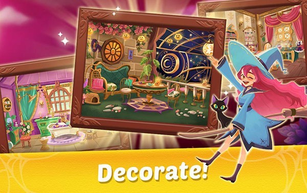1、欢迎来到女巫和猫!滑动积木以解决三消谜题并帮助女巫罗西装饰城堡。