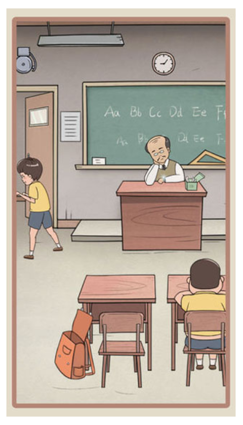 11、第二页,柜子里有吸尘器,第一页,吸尘器给胖胖,掉出辣条,被老师发现,拿胖胖桌子里的钥匙,开门。