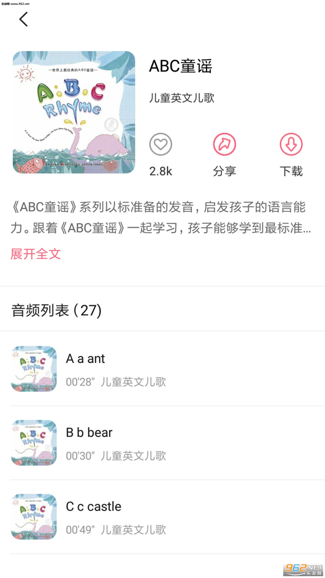 《儿童英文儿歌安卓版》是一款为朋友们打造的幼儿教育软件,本款软件主要是针对六岁以下的朋友,儿童英文儿歌app中有着众多的英文儿歌,父母可以一点点的为孩子播放,让宝宝们重小就打好英语的基础。