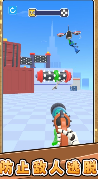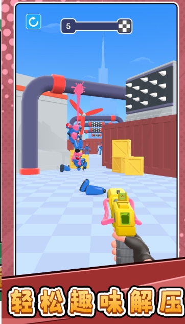 4、玩家使用武器射击机器人,利用场景机关躲避攻击,在规定时间内完成关卡任务,提升竞技排名。