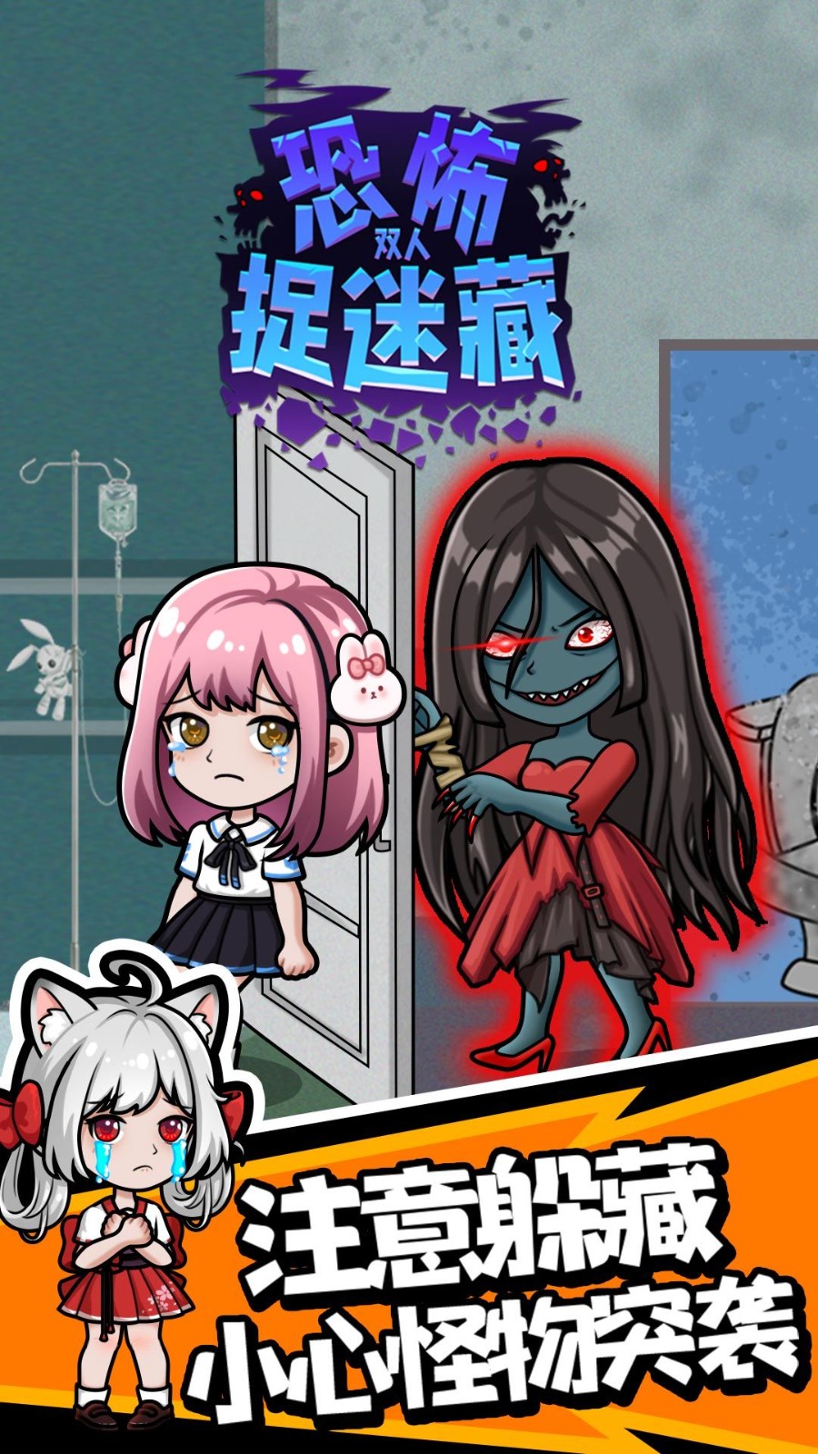 1、这是一款双人恐怖捉迷藏游戏,玩家置身阴森场景,需巧用道具躲避屠夫追捕,携手合作努力生存。
