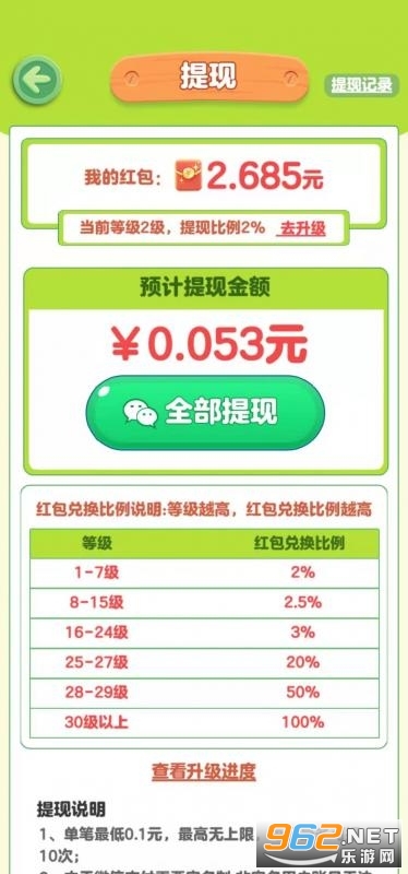 青青草原红包支持全部提现,不过有一个等级比例,例如等级再1-7级的时候可兑换红包比例为2%,在25级到27级提现比例是20%,30级以上奖励兑换比例提升到100%。