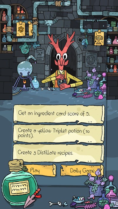 5、游戏中有5各秘密配方,将增加额外分数;如有一种药水叫做“双生”,同一类新的2张卡片相互放在一起时,就会产生双生配方。