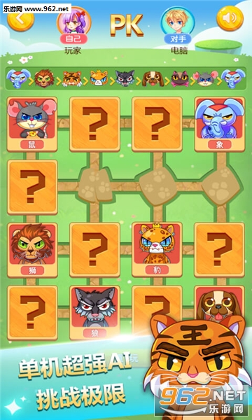1、每种野兽都有不同的行走方式,比如百兽之王的老虎,便能隔着一个野兽棋子将对面的棋子吃掉,你需要熟悉各自野兽棋子的行走规则,才能一步步取得胜利。