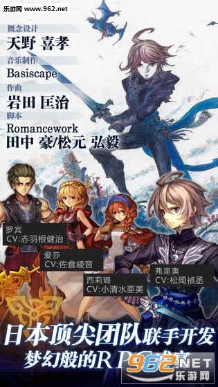 空前强大得制作阵容,本作由《最终幻想》系列的画师天野喜孝担任插画师,音乐监督则由同样参与过《最终幻想》系列配乐的岩田匡治担任,另外剧本则由Romancework的田中豪(曾担任过经典主机游戏“传说”系列的剧本)于松元弘毅担任。