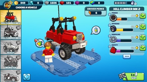 点击Play后,可以挑选不同的乐高积木赛车。选好心仪的赛车后,点击Go进入关卡并开始挑战。
