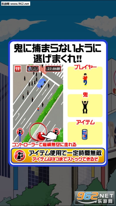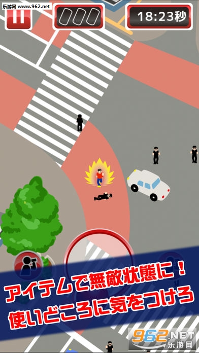 本作是一款简单易上手的休闲小品,玩家在游戏中扮演一个在涉谷逃亡的人,后面有一大堆警察在追捕,只要玩家在逃亡期间捡到道具就能在一定时间内无敌,被抓到则会直接GAME OVER。