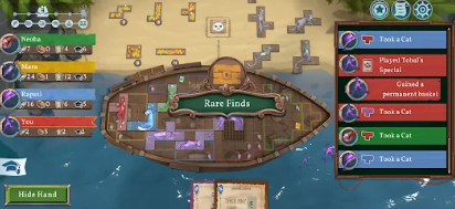 《 猫岛》是一款具有竞争力的中型计划卡轮抽放置板块游戏,可容纳1-4个玩家(其中6个具有扩展功能)。 您是小岛的公民。接受对猫岛的救援任务,必须在邪恶的Vesh到来之前营救尽可能多的猫。每只猫都由一个独特的板块代表并且属于一个家庭,您必须找到一种方法使它们都适合您的船上,同时保持和家人在一起。 您还需要在管理资源时: 探索岛屿(通过计划卡) 救援猫、寻找宝藏、朋友奥沙克斯并且学习古代课程。 您收集的每个课程都将为您提供另一种个性化的得分方式,并且共有38个独特的课程。 完成课程,充实自己的船,让猫咪们聚在一起得分,获胜者将是五个回合后得分最高的玩家。