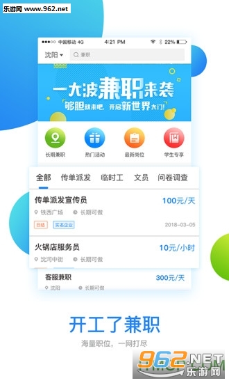 《开工了app》给玩家们带来了一款掌上趣味的网络兼职赚钱平台,现在正是暑假,是不是很多的学子们在家无聊没事呢。这款软件有海量的网上兼职任务,大家可以通过手机完成网上平台发布的任务兼职赚钱,下面就是小编为大家带来的软件下载地址!
