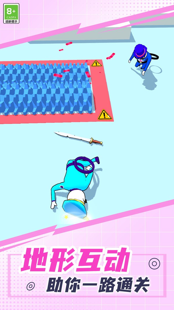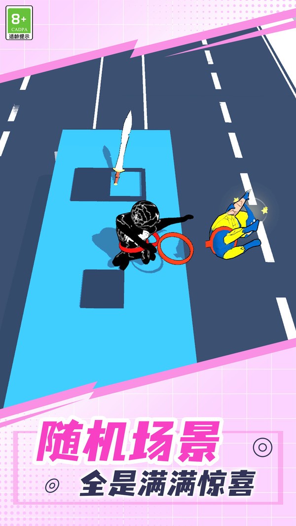 在游戏中,玩家需要扮演一名小兵,不断向前冲刺,闯过各种道路障碍和敌人,获取更高的分数。玩家只需要通过手指操作,让小兵跳跃、滑行、冲刺等动作,来躲避障碍物和攻击,并收集金币和道具。
