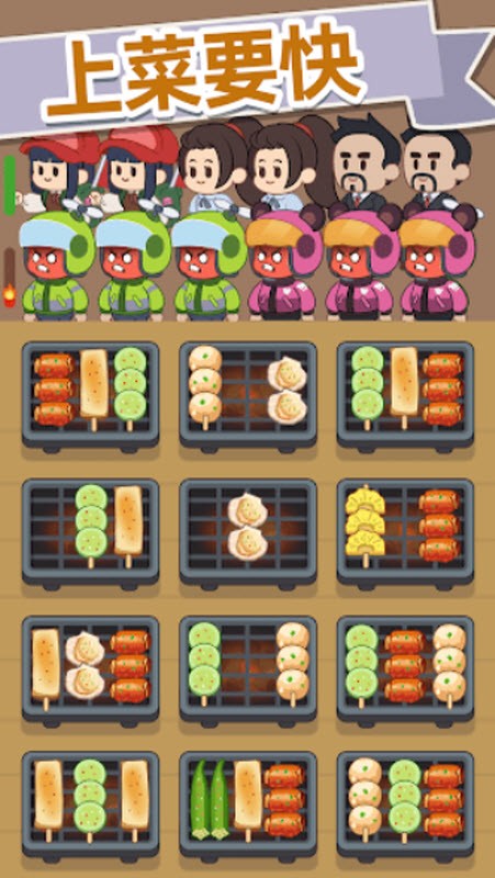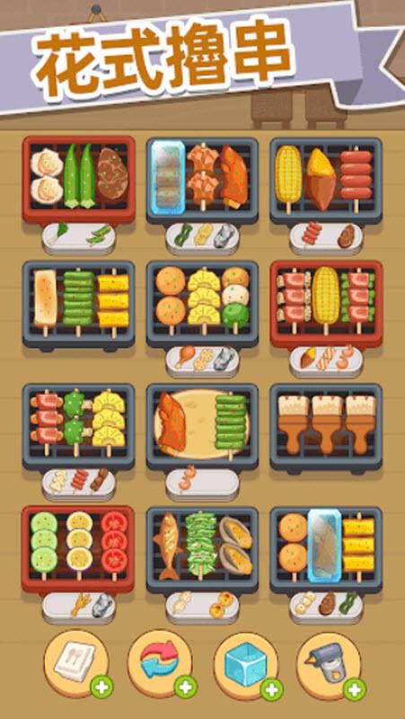 1、游戏的基本玩法是通过按住选中,将三个串烧放在一起进行打包。