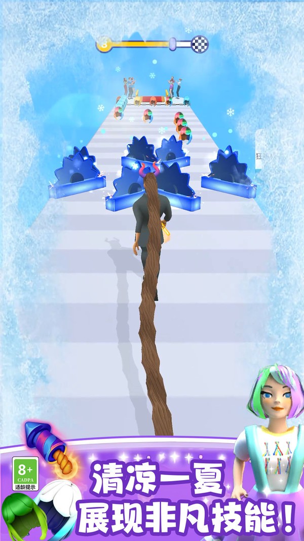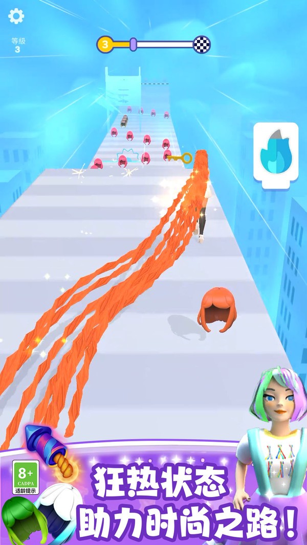 1、游戏背景设定在一个充满趣味与挑战的赛道上,玩家需要控制角色不断奔跑,收集沿途的头发,以增长自己的头发长度。